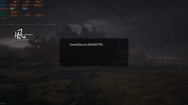 1080p DLSS開啟效能 => Overall Score 208.66 FPS,幀數增加約13.7%
