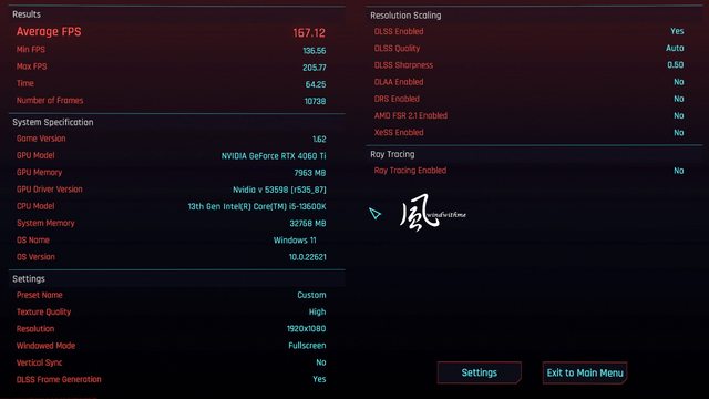 1080p開啟DLSS Auto => Average FPS 167.12,幀數增加約12.98%