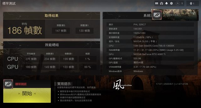 1080p開啟DLSS 平衡 => 平均幀數 186,幀數增加約37.8%