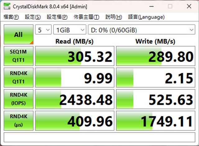 Q1T1均可達規格所標示讀取300MB/s(305MB/s)及寫入260MB/s(289MB/s)的性能。搭配