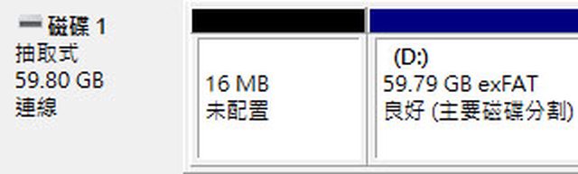 ▼在Windows磁碟管理內實際可用容量為59.8GB(因為廠商算法是1TB=1,000,000,000,000