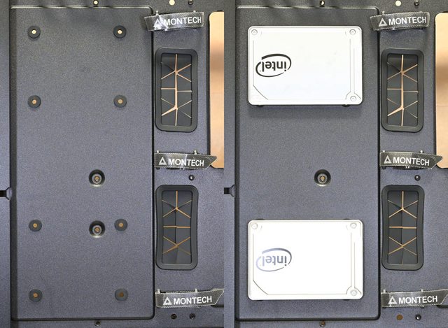 ●底板背面前方可安裝2個2.5吋SSD,底板背面右下方2個2.5吋固定架可安裝2個2.5吋SSD