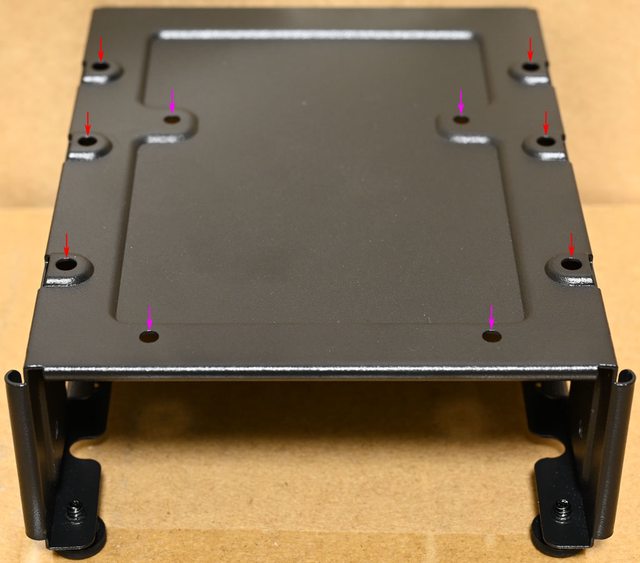 ▼3.5吋/2.5吋固定架頂部有3.5吋硬碟(紅色箭頭)及2.5吋SSD(紫色箭頭)固定孔