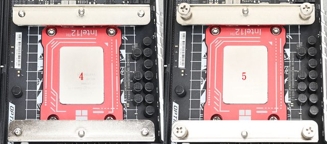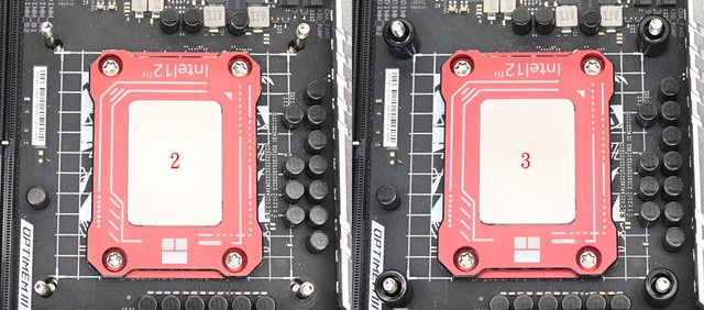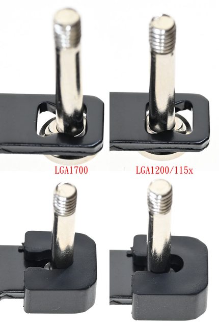 ▼將螺柱三角形凸面的邊朝沙漏型開孔外側裝(左上),為對應LGA1700平台使用;將螺柱