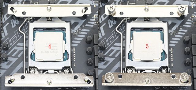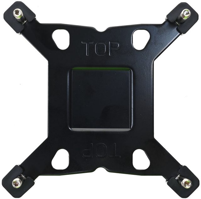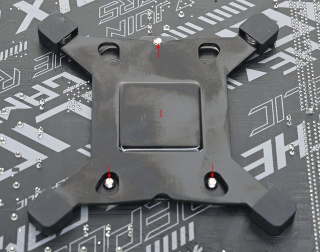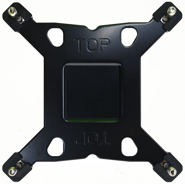 三角形凸面的邊朝沙漏型開孔內側裝(右上),為對應LGA1200/115x平台使用。確認螺柱底