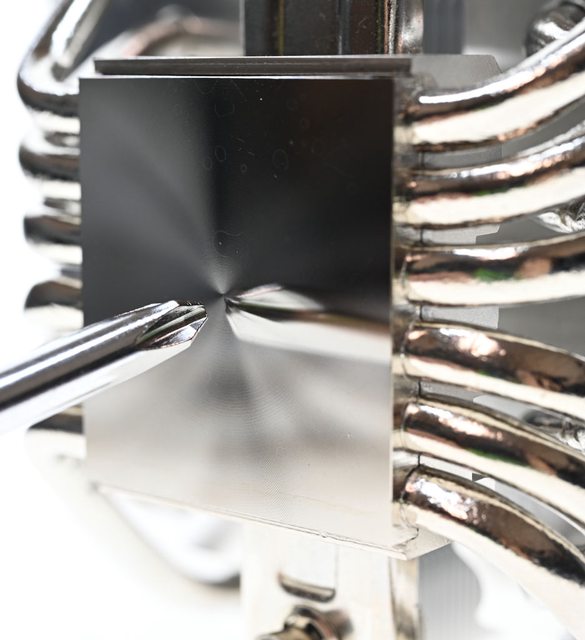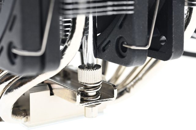▼將隨附螺絲起子從前塔溝槽插入已經安裝風扇的散熱器示意圖,可免拆風扇下拆裝散熱