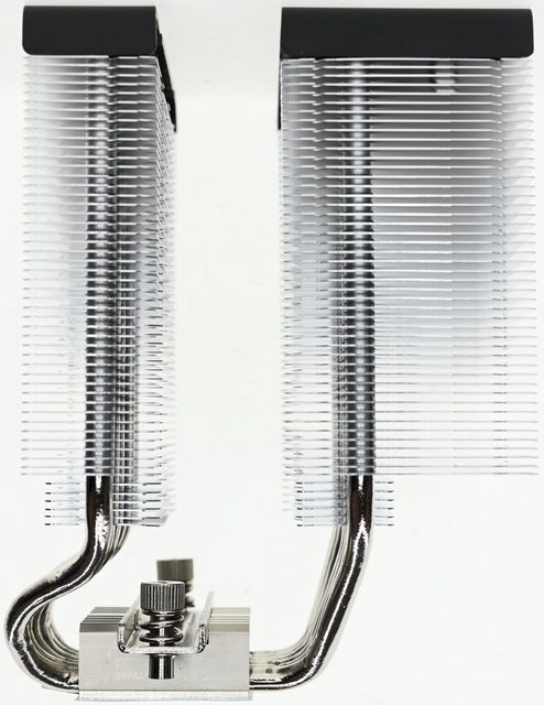▼散熱器本體採雙塔設計,底座左右各伸出6支熱導管,每個塔在6支直徑6mm熱導管上安
