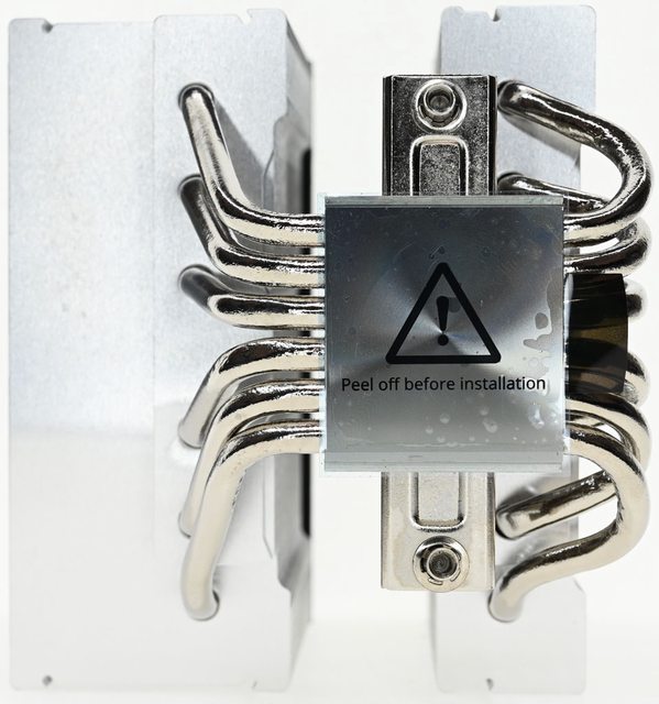 ▼散熱器底座的處理器接觸面有透明保護貼,上面用英文標示”安裝前撕除”