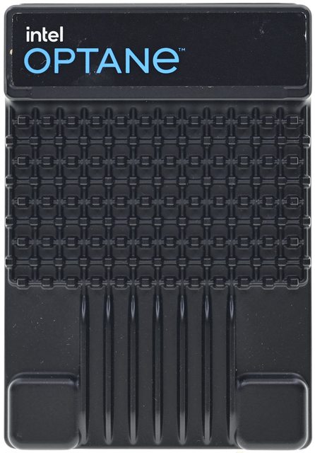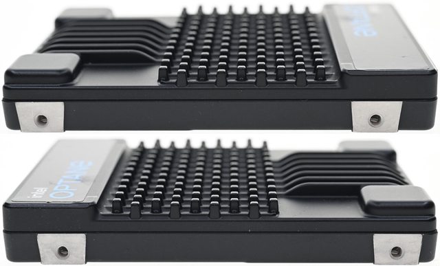 ▼本體金屬外殼正面有增大散熱面積的鰭片,最上方有Intel OPTANe貼紙