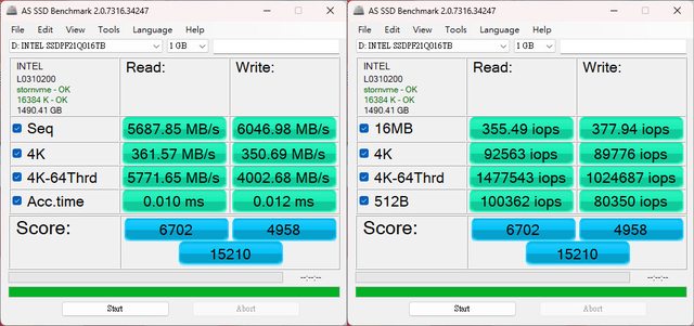 ▼Intel Optane SSD DC P5800X 1.6TB的AS SSD Benchmark測試