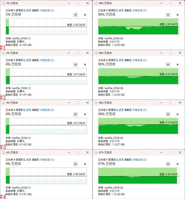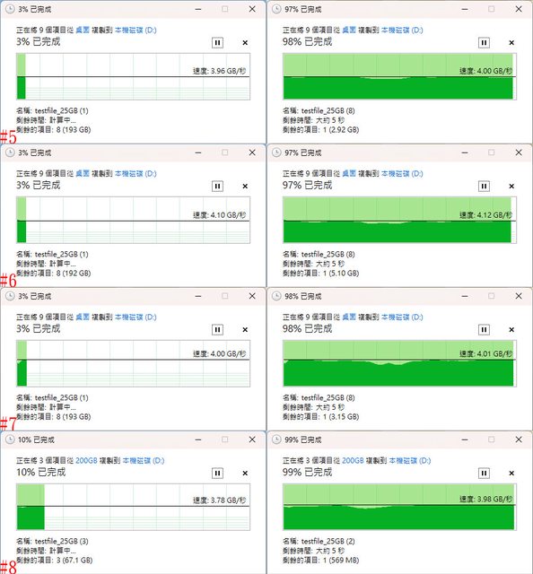 ▼第5至8次寫入狀況如下圖,第7次進度50%時略有波動,整體速度維持在3.78至4.12GB/s
