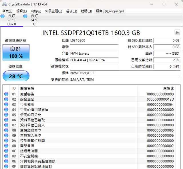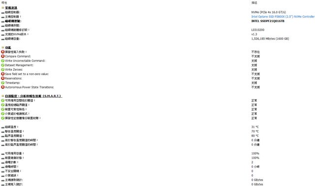 ▼Intel Optane SSD DC P5800X 1.6TB的CrystalDiskInfo資訊內容