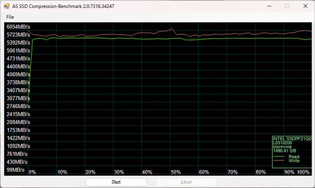 ▼Intel Optane SSD DC P5800X 1.6TB的AS SSD Compression-Benchmark傳輸速度測試