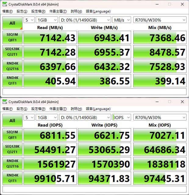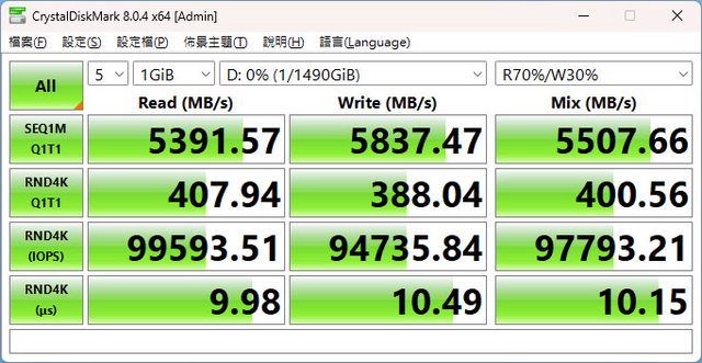 (NVMe)+Mix(R70%/W30%)傳輸速度測試