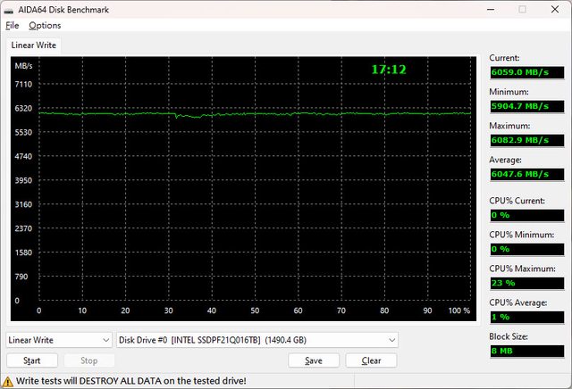 ▼Intel Optane SSD DC P5800X 1.6TB的AIDA64 Disk Benchmark連續寫入測試,最高速