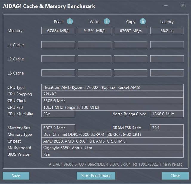 AIDA64跑了個測試延遲能夠低於60ns、讀取也稍微提升