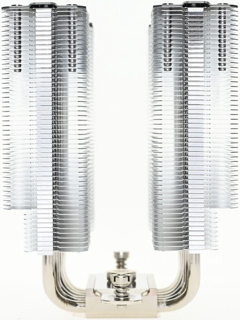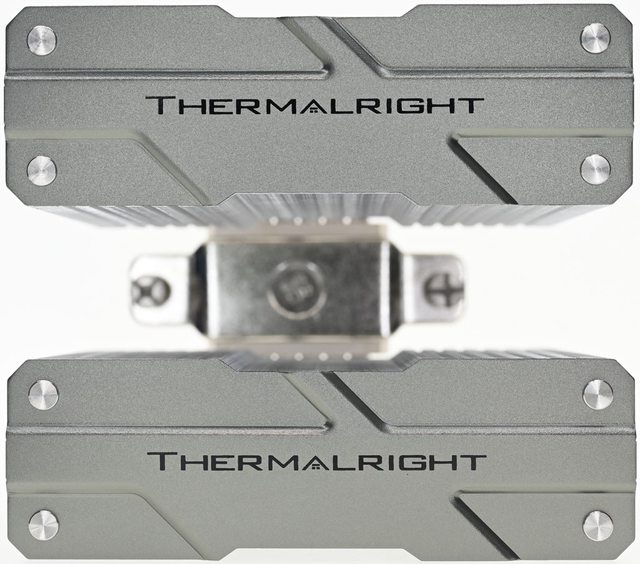 ▼從側面看雙塔結構,前塔及後塔下方9片散熱鰭片縮小,提供記憶體閃避空間,壓板中