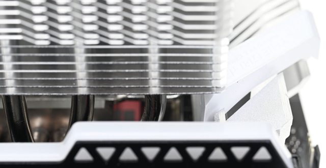 ▼散熱器本體採雙塔設計,底座兩邊各伸出6支直徑6mm無重力熱導管,並在熱導管上安裝