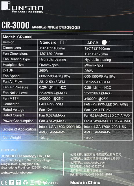 JONSBO喬思伯CR-3000散熱器規格: