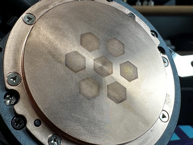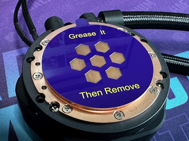冷頭銅底為圓形,預貼一張輔助塗抹散熱膏的貼紙,只要將散熱膏均勻抹在中間7個六角
