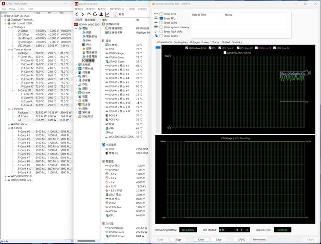 先以裸機平台搭配i7-12700K @1.32V 230w左右進行測試,單烤FPU大概都在80度以內沒什