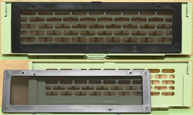 ▼頂部通風網孔板背面配置不可拆卸的過濾網,安裝時下方凸出卡榫朝向前方插入上蓋開