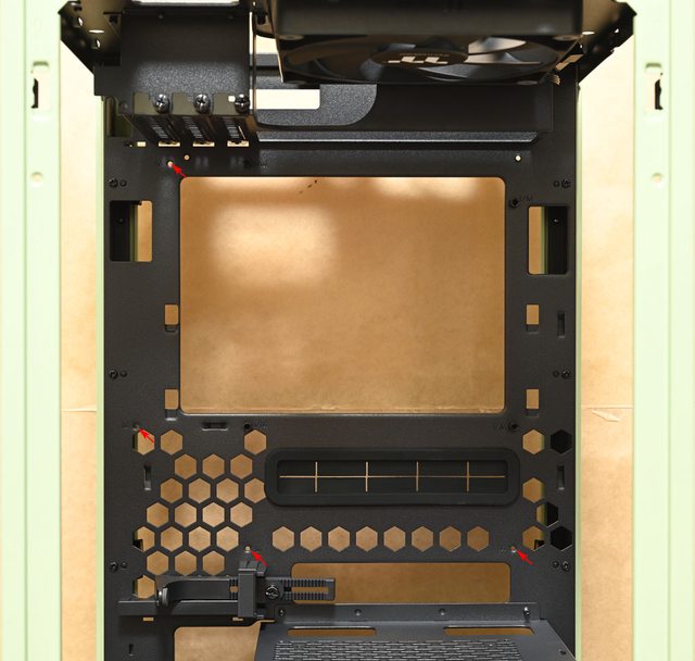 ▼主機板後方可拆卸式固定板上方使用2個手轉螺絲(紅色箭頭)固定,下方兩側有卡扣,
