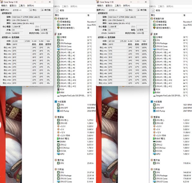 ▼安裝IMF70-ARGB風扇時高負載前(左)及高負載30分鐘後(右)的Core Temp和AIDA64感測