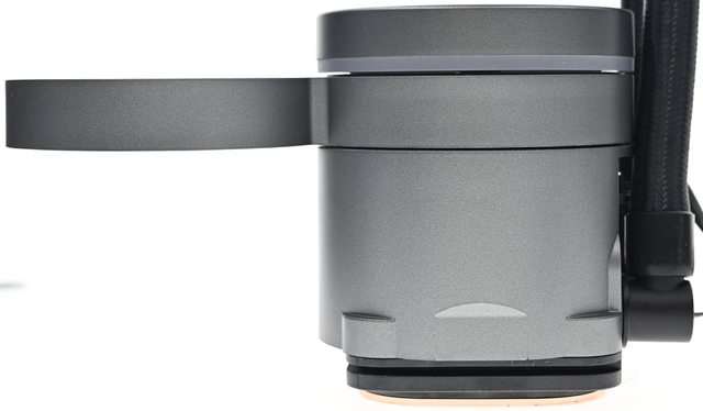 ▼風扇外觀有如2個相連的圓餅,左邊基座固定在水冷頭上,右邊是風扇,9葉片乳白色扇