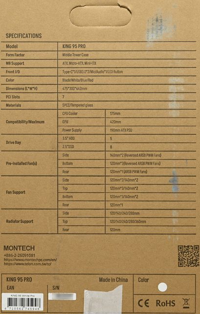 ▼配件盒正面有商標、顏色標示、KING 95字樣、正面網孔板安裝圖、左艙底部3.5吋/2.5