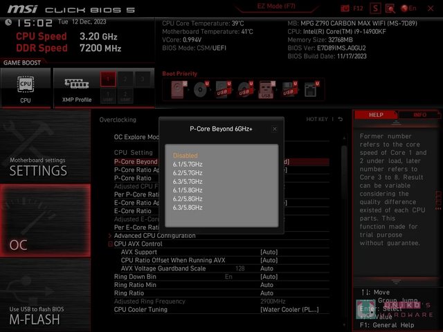 P-CORE 可以設定大於 6 GHz + 頻率設定,有多種組合可以選。