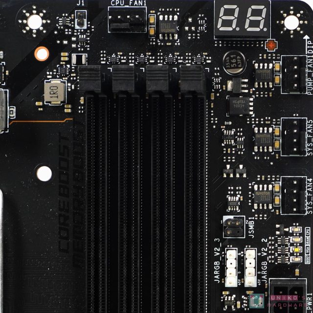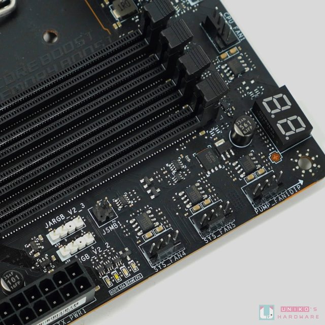 Z790 CARBON MAX WIFI PCB 右上方的改動比較大,一些 ARGB 3-PIN 和 PWM 4-PIN 還有 E