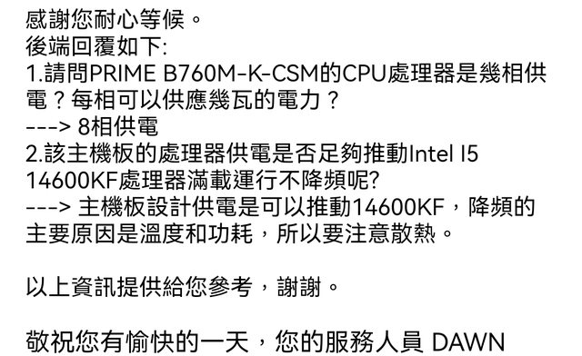 華碩回覆在溫度功耗許可下,主板供電是可以推動14600KF的。
