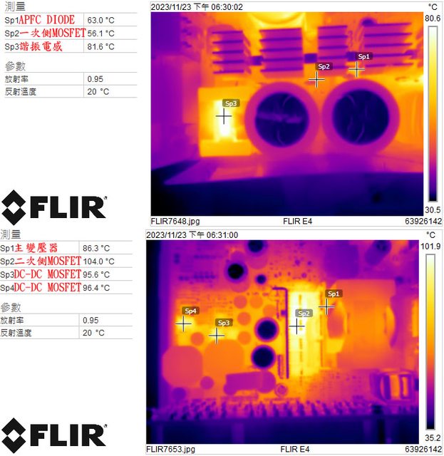 ▼電源供應器滿載輸出下APFC DIODE/一次側MOSFET/諧振電感(上圖)及主變壓器/二次側