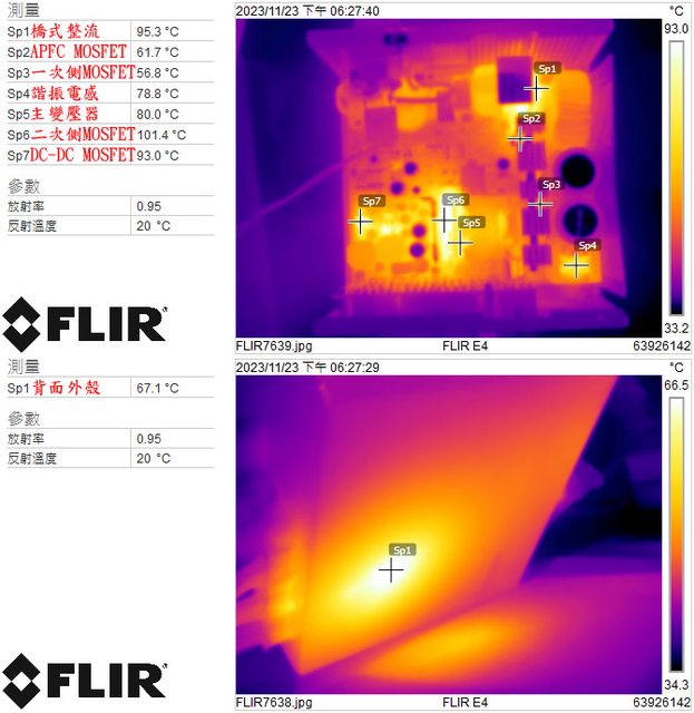 ▼電源供應器滿載輸出下內部(上圖)及背面外殼(下圖)的紅外線熱影像圖(附註:安裝位