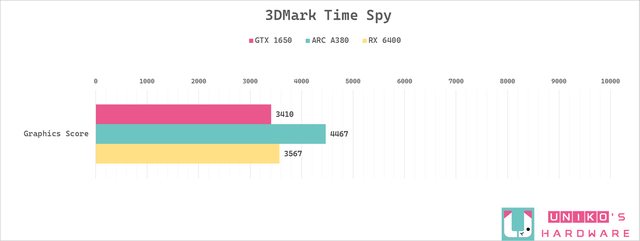 不免俗的還是要跑一下 Benchmark,首先是 3DMark,Time Spy 中 ARC A380 分數最高,Fi