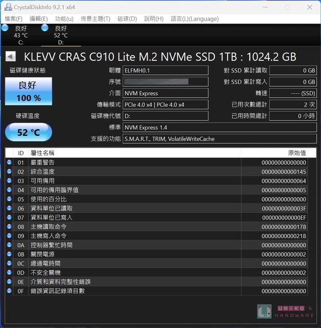CrystalDiskInfo 中可以看到 CRAS C910 LITE 的規格資訊,採用 NVM Express 1.4 介面