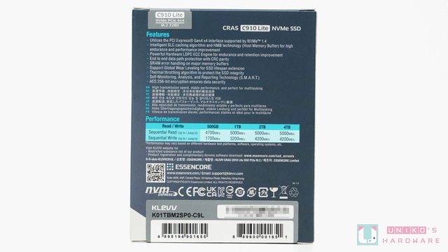 KLEVV CRAS C910 LITE 包裝左上角為 KLEVV 品牌 LOGO 跟產品型號,右上角標示容量和連