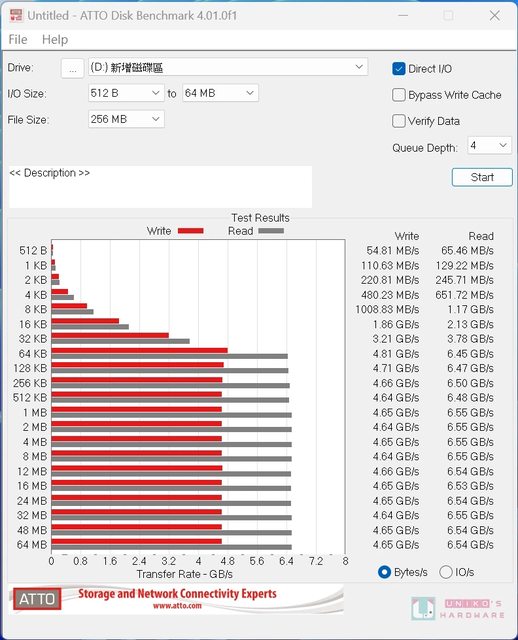 ATTO Disk Benchmark 4.01,寫入最高 4.81 GB/s、讀取最高 6.55 GB/s,IO 讀取區塊 51