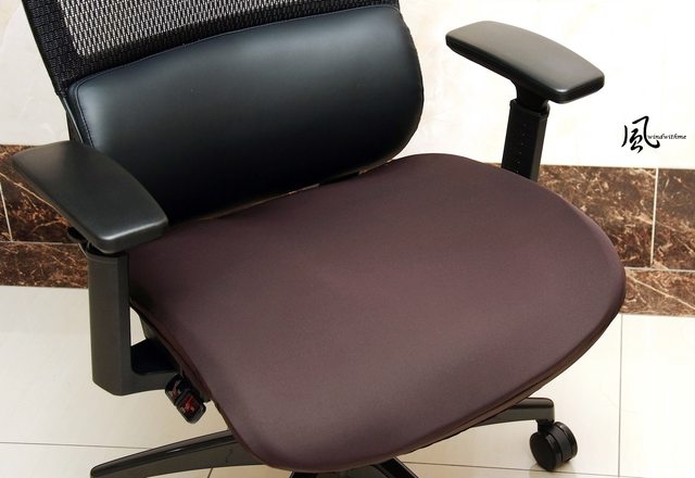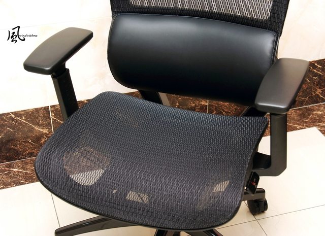 椅背同樣採用透氣網布,PU皮革腰靠為固定式,依體型不同可能需坐姿稍微往後時較容易