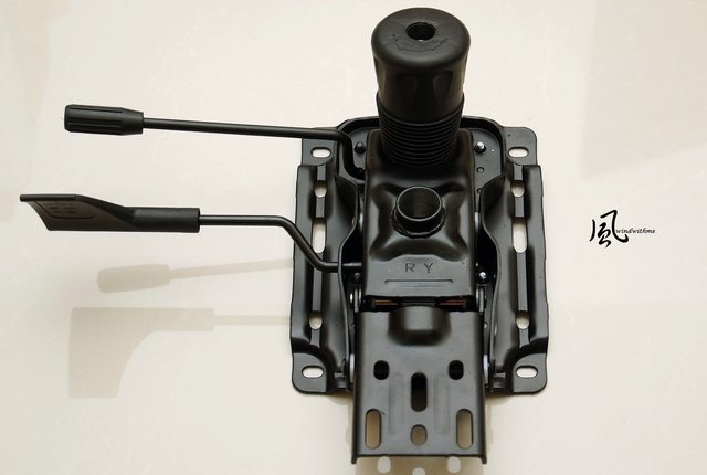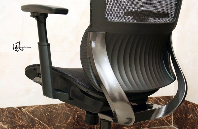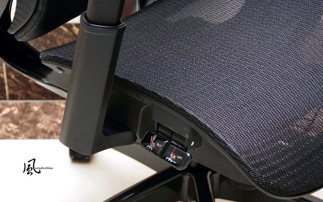 另一側調整分別為椅背傾角與座椅高度,此處近看尼龍框架搭配透氣網布的坐墊。