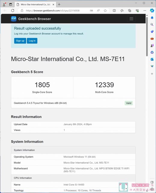Geekbench 5.4.5 單核心 1805,多核心 12339。