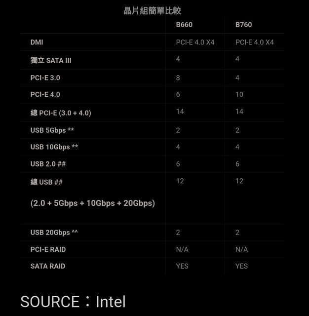 ^^:每 1 個原生的 20Gbps 都是利用 2 個原生的 10Gbps 來換取,INTEL Z790 B760 晶片
