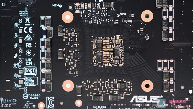 邊遍佈電子元件和電路設計,為 RTX 4070 SUPER 核心晶體供電。華碩特別為 GDDR6X 補上