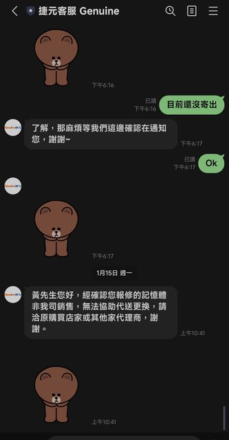 : 捷元客服在LINE回覆「經確認您報修的記憶體非我司銷售,無法協助代送更換,請洽原購買店家或其他家代理商,謝謝。 」