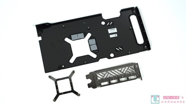 把顯示卡拆開來,除了金屬散熱器和 PCB,還有金屬背板、I/O 檔板和核心晶片的背部扣具