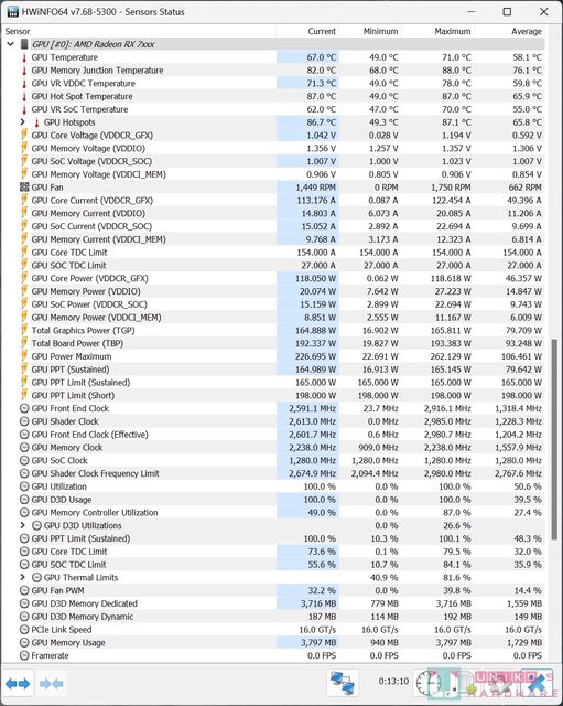 數據來看,預設情況下 GPU POWER MAX 大概是 200W。AMD 軟體容許再提高 20% POWER,最