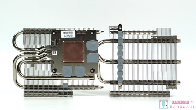 3 根熱導管都有完整佔據所有鰭片,每根熱導管成 C 字形被焊接在鰭片之中。從熱導管表