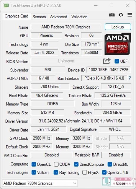 心 12 執行緒,內顯分別使用 Radeon 780M、12 組 CU、顯示卡頻率 2900 MHz 和 Radeon