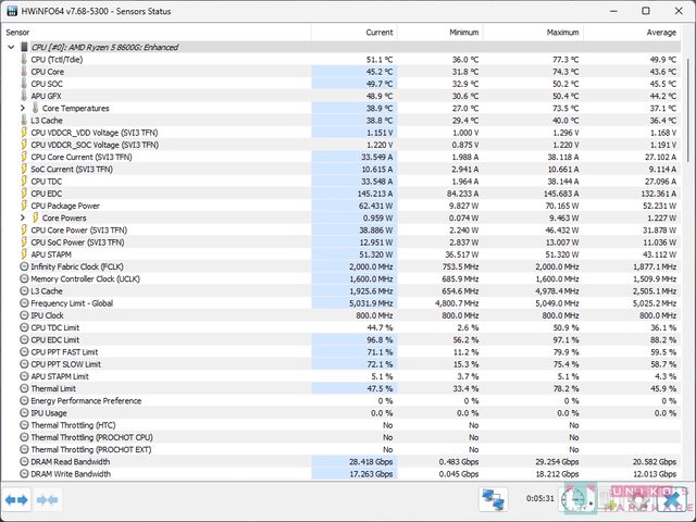 R5 8600G 的 CPU Tdie 51.1 度、GPU 49.8 度,CPU Package 功耗約 62 W。